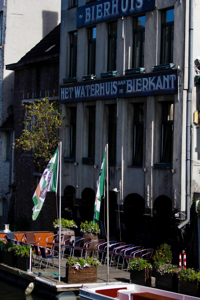 We dropped our luggage and hit the town, thirsty for our first taste of real Belgian beer. I had seen in photos a place called Her Waterhuis aan de Bierkant which is right on the canal and right over the bridge from our hotel, so we headed there. We found a table on the canal, Pa ordered a blonde on tap called Augustijn and I ordered the kriek on tap and we were in Belgian heaven.