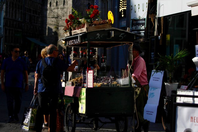 Cuberdons are a Ghent candy, also known as “Ghent noses” because of their conical shape. The original flavour is raspberry, and they’re chewy on the outside and liquid in the middle. There are 2 cuberdons hawkers in the main square and apparently they are bitter rivals – apparently one gives you a better deal than the other. We decided to get a 3€ bag (he just grabs a handful and puts it in a bag) and move on…right next door to a waffle place. The last time Ma and Pa were in Belgium they didn’t get to have real Belgian waffles, so we made sure we took care of that on the first day here – so we each ordered one, crispy and covered in caramel.