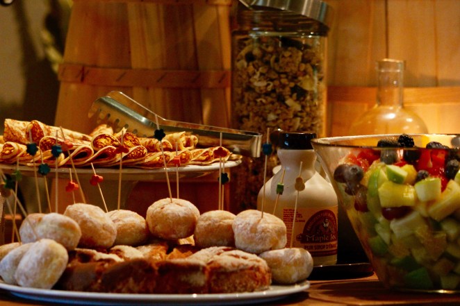 The Normandy area of France is famous for a few culinary delights – Camembert, mussels, butter, caramel and cider/calvados. I had discovered months ago that a cidery in a small village called Rots offered a generous Sunday morning brunch, and thought it would a fun alternative to birthday dinner. So we got up and hit the very soggy road (it ended up raining all day) westbound towards La Ferme de Billy. The village of Rots itself is adorable – stone buildings, lantern-like street lamps and the obligatory church with graveyard. We pulled into the well-marked cidery and it was beautiful, and the inside was even better – rustic yet modern decoration with a “salty” buffet table, a “sweet” buffet table and a bottle of home made apple juice on every table. The hostess seated us and encouraged us to get up and fill our plates, but we sat, a little shell shocked by the sheer amount and variety of food.
