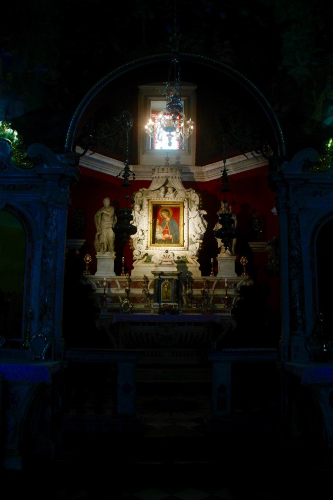 The line moved forward slowly, and pretty soon we were in one of the church caves. You had to duck through a little doorway, with a worker ushering people in and out. Soon I noticed there was an end to the line at the end of the church cave, and I thought I saw people kissing a small painting of an icon before turning away. When I got to the front of the line, I watched the woman in front of me kiss the painting, cross herself, turned to the orthodox priest who was standing there and I had failed to notice, who waved a cross at her and she left.